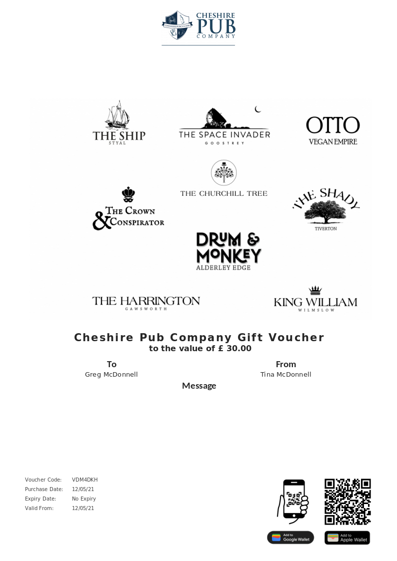 Cheshire Pub Company allows you to purchase instantly printable gift vouchers, special offers and tickets using the Voucher Connect platform.